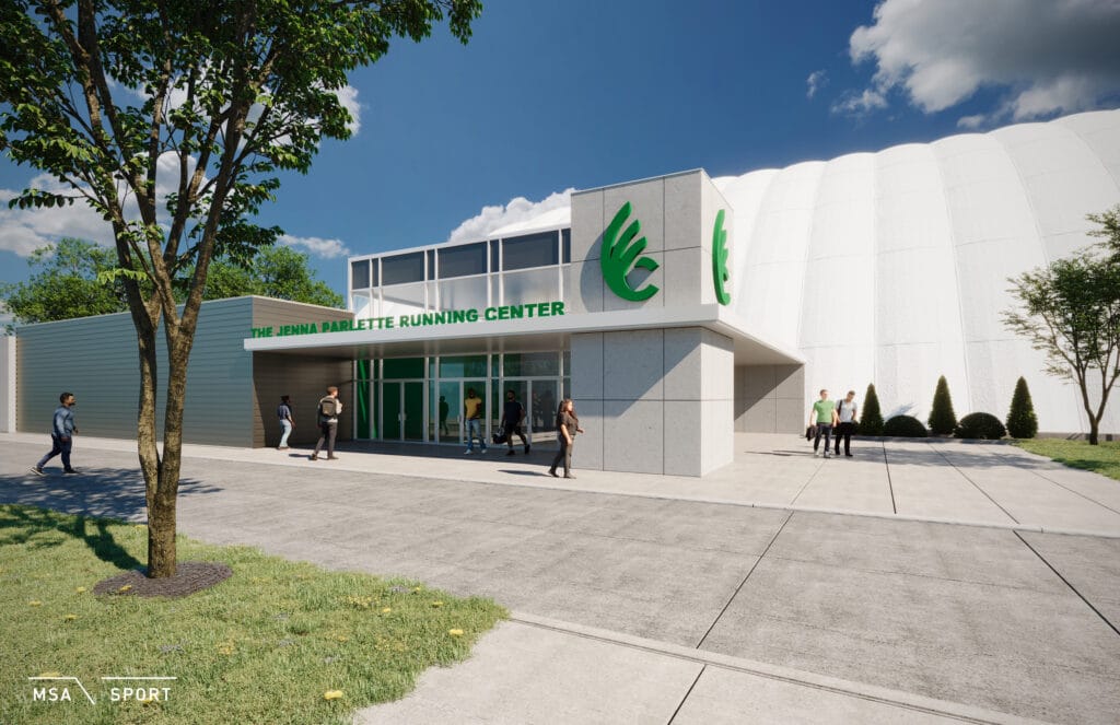 The architect’s rendering of the Jenna Parlette Running Center façade displays the main entrance and the track’s bubble structure.
