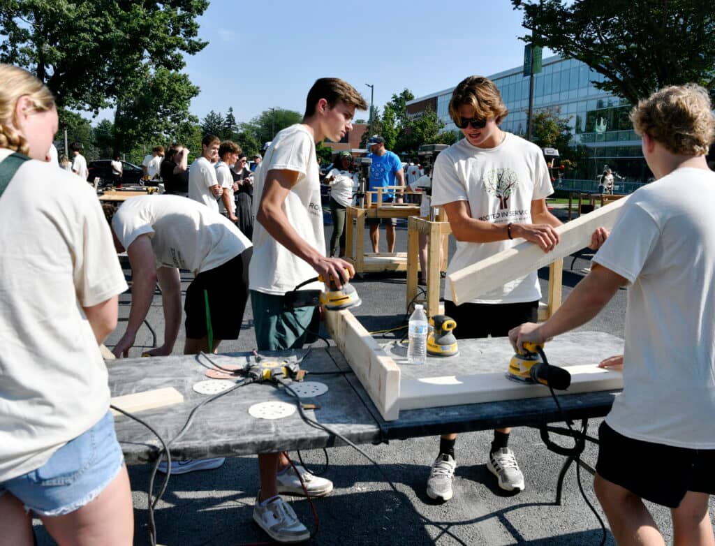 New students engaged in service projects as part of their three-day orientation program. Pictured are students sanding boards to be used in making children's beds for the local organization, Sleep in Heavenly Peace. Other students worked at Hope House, Sugartree Ministries, Prairie Oaks Retirement Village, the Clinton County Homeless Shelter, WC's Community Gardens and Hazard Arboretum, while others picked up trash along city streets.