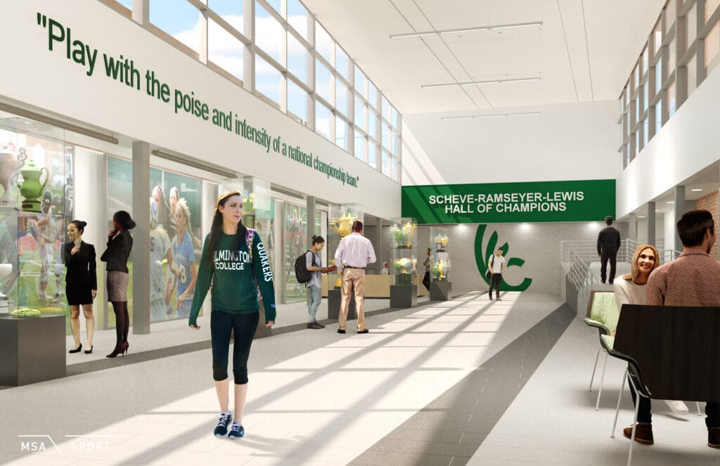 New construction associated with the Scheve Athletic Center features a grand entrance off Elm Street, located in the space between Hermann Court and the QRC, the Hall of Champions and a new façade on the street-facing side of the QRC. Scheve wished to build the Hall of Champions as a means of recognizing the College’s significant success in its athletic programs throughout its history. Its namesakes are Scheve and, per his wishes, two other legendary WC coaches, Bill Ramseyer and Bud Lewis, both of whom are enshrined in WC’s Athletic Hall of Fame.