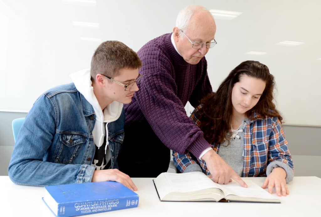 PICTURED: In fall 2018, Bill Kincaid reviews a math concept with then-seniors T.J. Burbage and Kayla Marrero.
